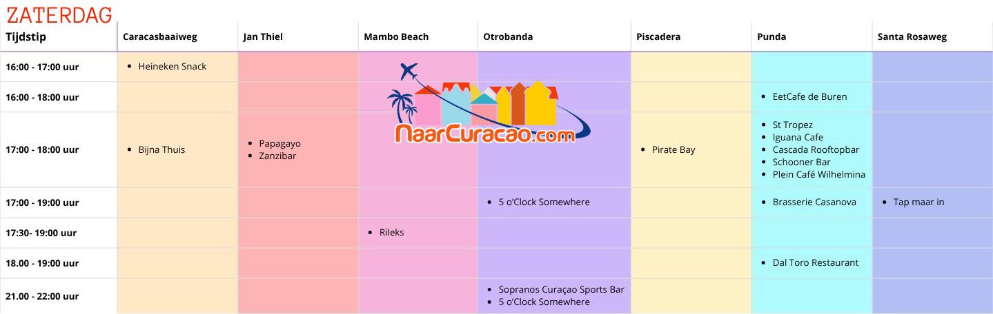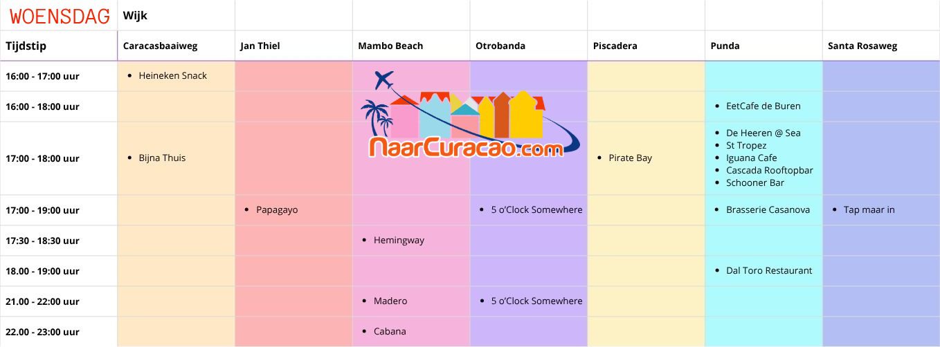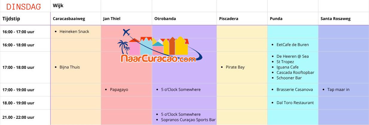 In een poging alle Happy Hours van Curacao overzichtelijk te maken voor je, hebben we deze XXL tabel gemaakt. Omdat het zoveel is, hebben we er één tabel per dag van gemaakt, totaal 7 tabellen voor de hele week. Bekijk je de tabellen op je telefoon, kantel dan je telefoon zodat je maximaal breed scherm hebt voor een zo goed mogelijk overzicht.